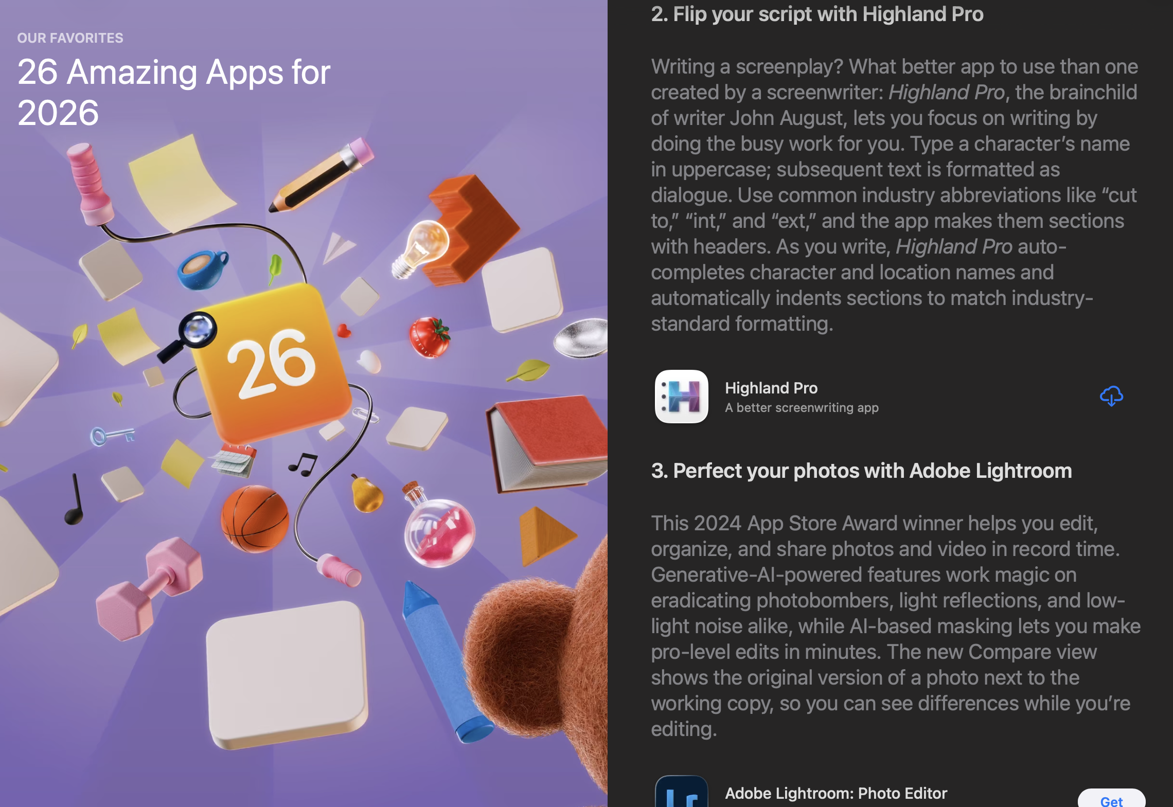 Launched the Scriptnotes book with a live show at Dynasty Typewriter. Turned in rewrite of Laika project. Finished office sound panel installation. Spent a week in Mexico City. The thumb I smashed in April has finally regrown its nail. Apple featured Highland Pro as one of its 26 Amazing Apps for 2026.